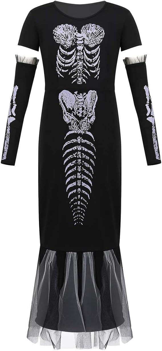 Dpois Robe Longue Fille Enfant Robe Noir Robe De Bal Deguisement Squelette Manches Gants Bodycon Robe Squelette Impression Halloween Cadeau 5 16 Ans Amazon Fr Vetements Et Accessoires