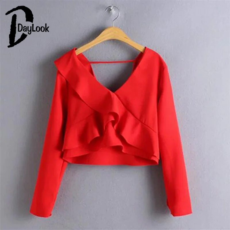 Daylook Femmes Elegant A Volants Rouge Crop Top Dentelle Dans Le Dos Double V Cou Pull Chemisier Top Chic Manches Longues Dos Nu Blusa Aliexpress