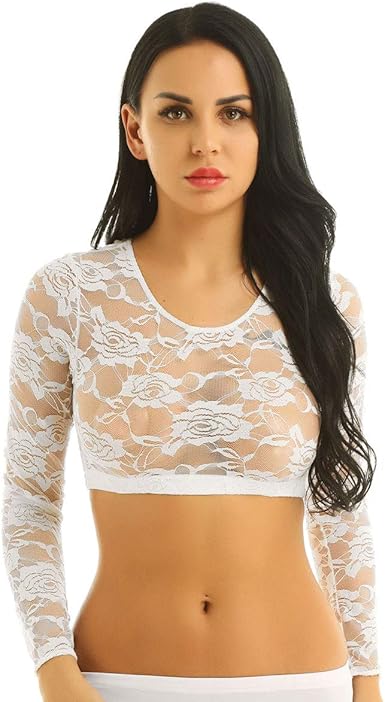 Tiaobug Femme Top Dentelle Court T Shirt A Manches Longues Transparent Haut Danse Soiree Casual Chemisier Ete Blouse Mini Veste Clubwear S Xl Amazon Fr Vetements Et Accessoires