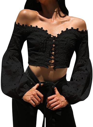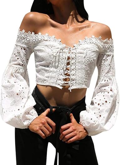 Sixcup Sexy Epaule Crop Top Femmes Puff Manche Longue Creux Dentelle Fleurie Blouse T Shirt Chemisier Coton Couleur Pure Amazon Fr Vetements Et Accessoires
