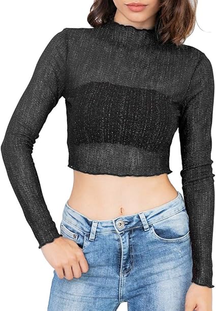 T Shirt Sexy Crop Top Sheer Crochet Col Haut Femme T Shirt A Manches Longue Avec Maille Haut Paillettes Femmes Sexy Chic Pull Femme Chaud Top Dentelle Tee Shirt Femme Shirt Winjin Amazon Fr Vetements