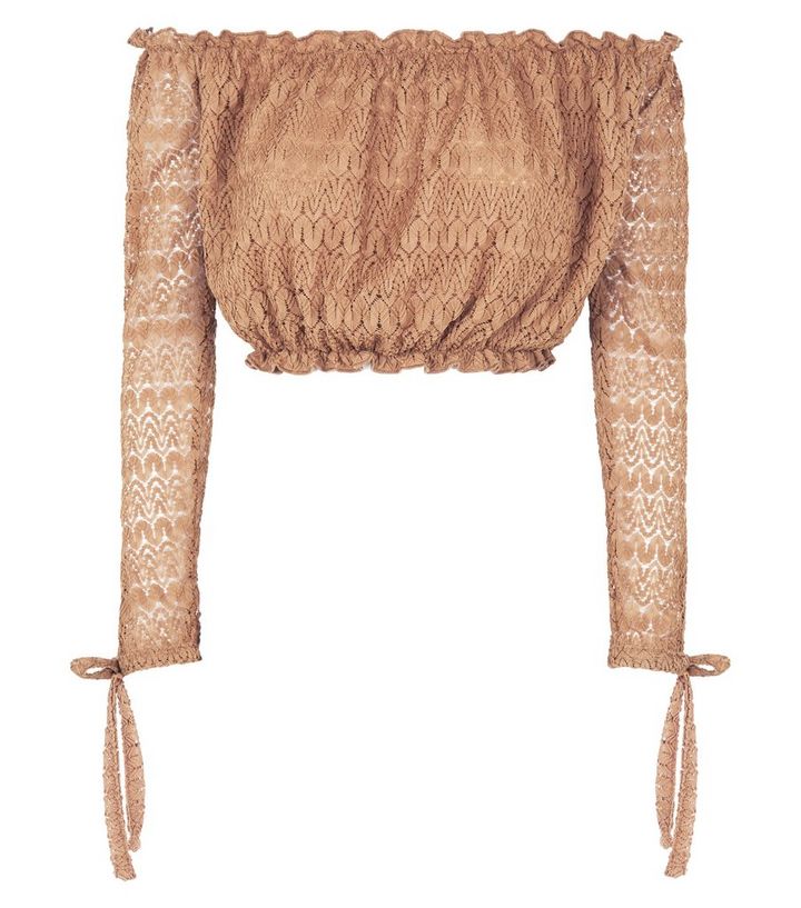 Crop Top Camel En Dentelle A Col Bardot Et A Manches Longues New Look