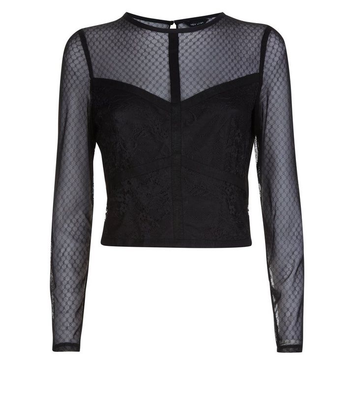 Crop Top Noir En Tulle Et En Dentelle A Manches Longues New Look