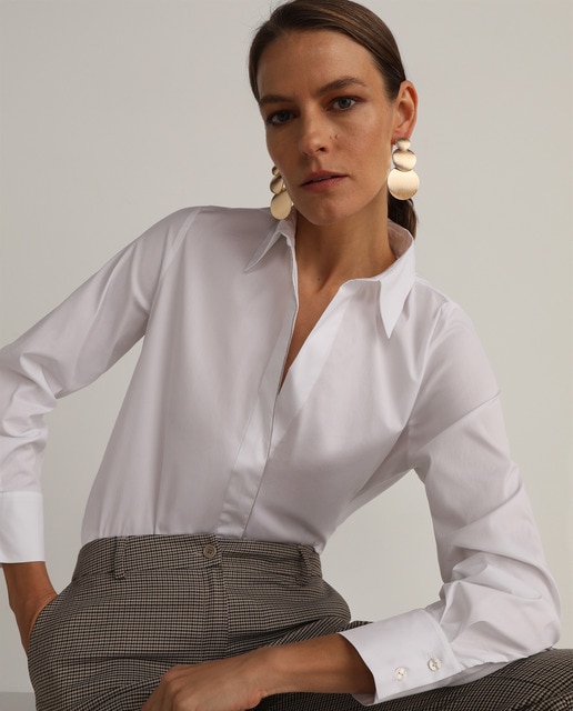 Curling Blouse Woman In White Cotton Poplin And Mother Of Pearl Buttons