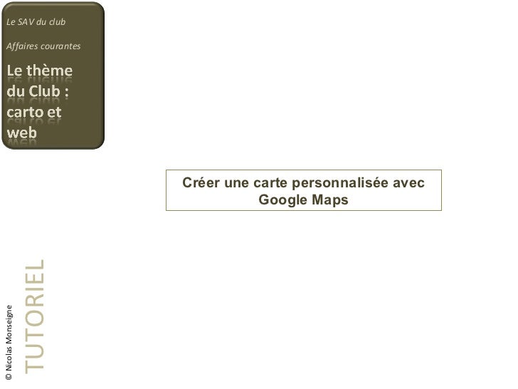 Créer une carte My Maps Pour commencer à créer une carte, vous pouvez le faire de deux façons Depuis internet en spécifiant « Google My Maps » depuis la barre de recherche;. 7 Serveurs de cartes géographiques Plusieurs outils libres permettent aux professionnels de la cartographie de créer des serveurs de cartes géographiques. Créer une carte Google Maps personnalisée Créer une carte Google Maps personnalisée Google Maps est l’un des services les plus populaires de Google Je ne vais pas vous faire un cours dessus, vous l’avez déjà tous utilisé Depuis Juillet 12, la version 3 de son API JavaScript est devenue la version officielle.