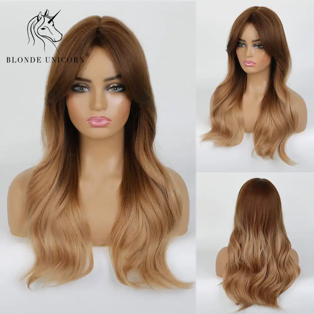 Blonde Licorne Synthetique Vague Naturelle Cheveux Longs Perruques Avec Frange Laterale Racine Sombre Ombre Brun Quotidien Perruque Pour Blanc Noir Femmes Aliexpress