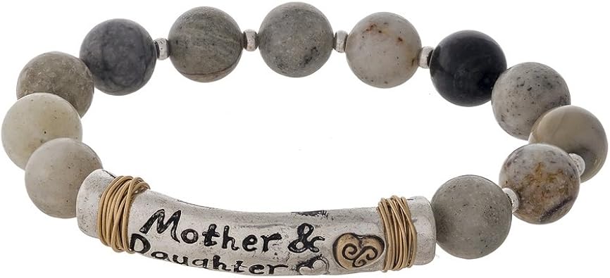 Les Plaisirs De Stella Bracelet Fantaisie Elastique Perles En Pierre Naturelle Grise Et Plaque Metal Argente Et Dore Mother Daughter Amazon Fr Bijoux