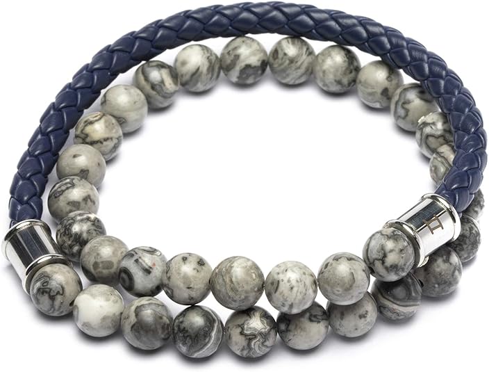 Gemini Bracelet En Pierre Naturelle Jaspe Grise Et Cuir Bleu Olympus Twin Blue O3 Taille M Amazon Fr Bijoux