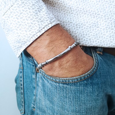 Bracelet Homme Tube Argente Et Pierre De Jaspe Grise Map Stone Homme Bracelet Souple Maty