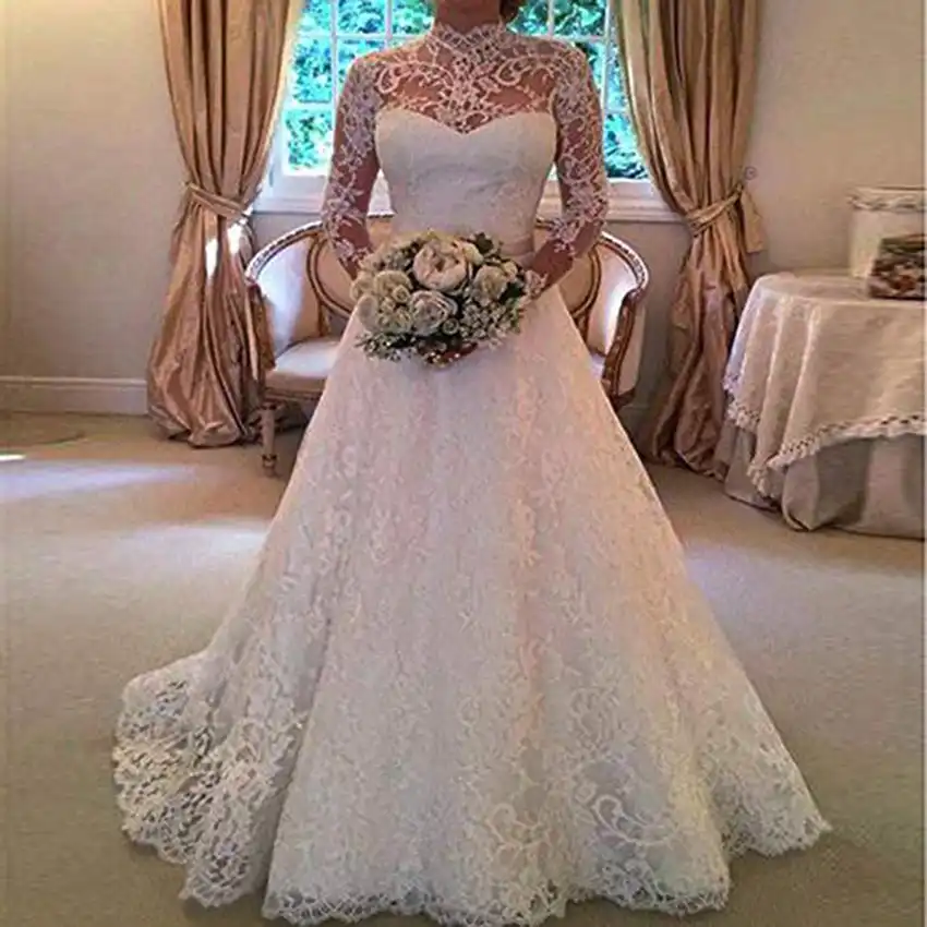 Liyuke Robe De Mariee En Dentelle Trapeze Robe De Mariee Elegante Avec Manches Longues Fermeture A Boutons Aliexpress