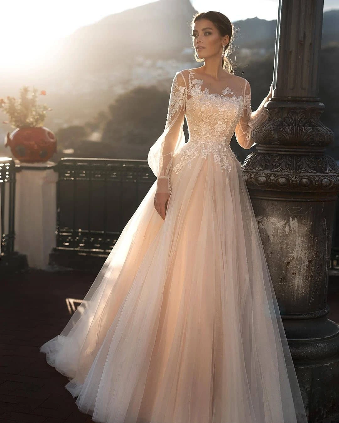 Vivian 19 Illusion O Cou A Ligne Robe De Mariee Elegante Manches Bouffantes Dentelle Appliques Duveteuse Couche Tulle Robe De Mariee Aliexpress