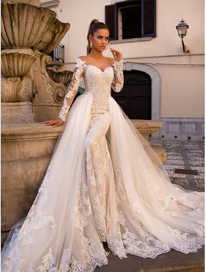 Lszhgl Robes De Mariee Elegante Robe De Mariee En Dentelle Robe De Mariee Dentelle Romantique Detachable Train 2 En 1 Off Epaule Robes De Mariee Amazon Fr Sports Et Loisirs