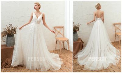 16 Elegante Dentelle V Cou Robe De Bal Robe De Mariee Applique Dentelle Avec Strass