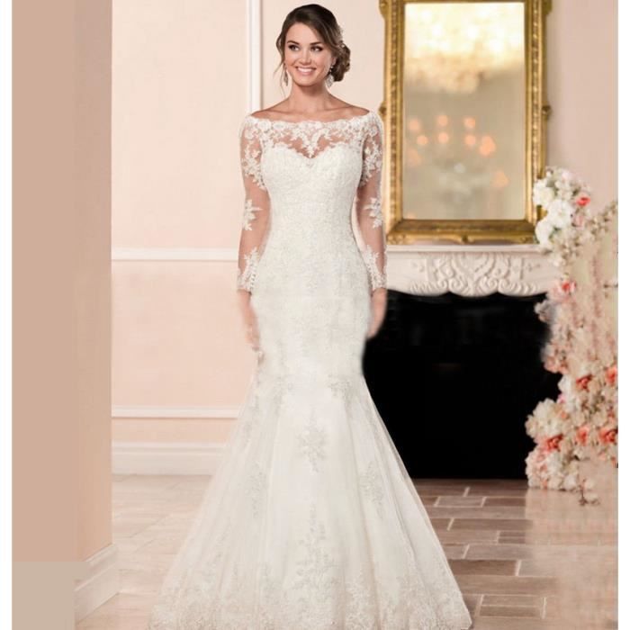 Robe De Mariee Elegante Traine Sirene Col Haut Manches Longues Dos Couvert De Tissus Transparents Applique De Dentelle 32 46 Blanc Blanc Achat Vente Robe De Mariee Cdiscount
