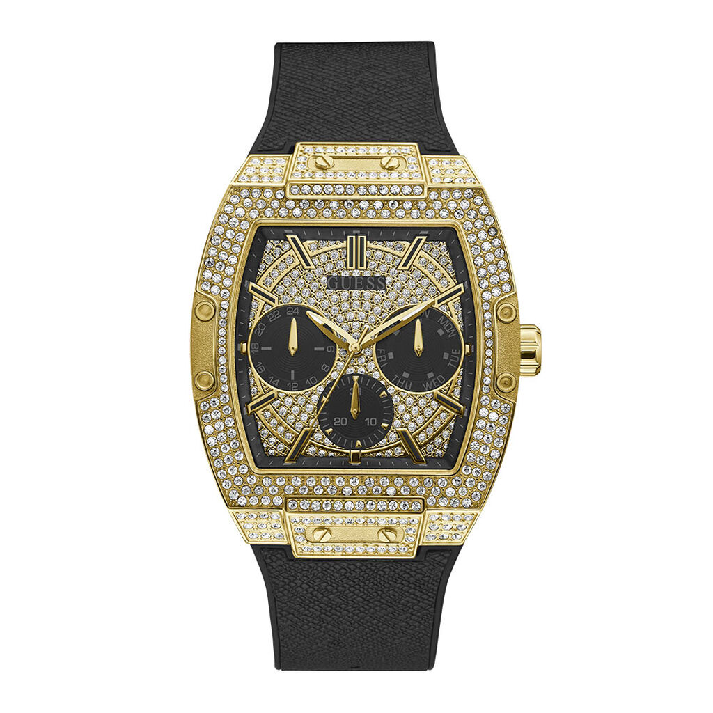 Montre Guess W1132g1 Frontier Boitier Acier Dore Brillant Avec Cristaux Cadran Noir Multifonction Bracelet Silicone Noir Avec Cristaux Homme Sur Bijourama Montre Homme Pas Cher En Ligne