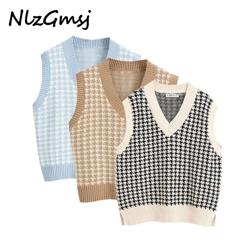 England Style Vintage Plaid Houndstooth Sleeveless Loose Vest Za Sweaters Women Pull Femme Sweaters Women Pullovers Tops Aliexpress