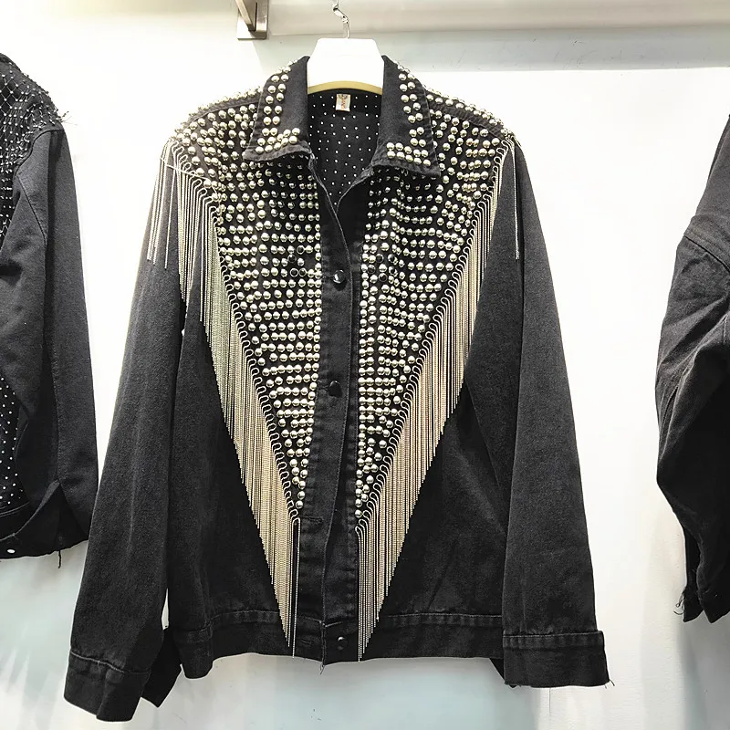 Automne Nouvelle Femme Veste Denim Manteau Femmes Lache Lourd Main Perle Cloute Rivet Chaine Gland Vestes Harajuku Jeans Manteau Femme Aliexpress