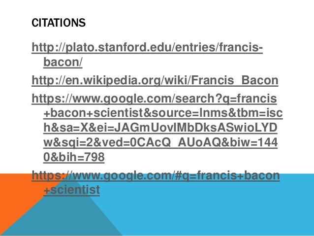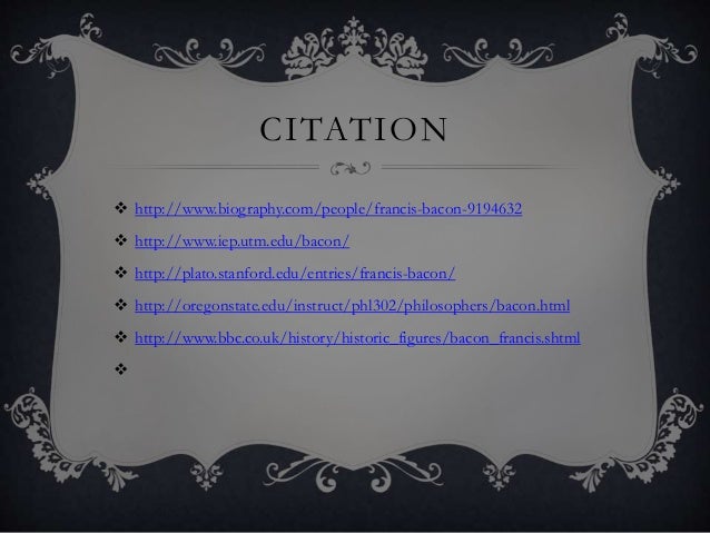 Citation francis bacon. Father of the scientific method and the first major English essayist, Francis Bacon published Of the Proficience and Advancement of Learning, Divine and Human in 1605 This philosophical treatise, intended as an introduction to an encyclopedic study that was never completed, is divided into two parts the first part broadly considers "the excellency of learning and knowledge";. 22 January 1561 – 9 April 1626), also known as Lord Verulam, was an English philosopher and statesman who served as Attorney General and as Lord Chancellor of EnglandHis works are credited with developing the scientific method and remained influential through the scientific revolution. Francis Bacon in 17th/18th Century Philosophy Remove from this list Export citation Bookmark The Florentine Academy and the Advancement of Learning Through the Vernacular The Orti Oricellari and the Sacra Accademia Armand L De Gaetano forthcoming Bibliothèque d'Humanisme Et Renaissance.