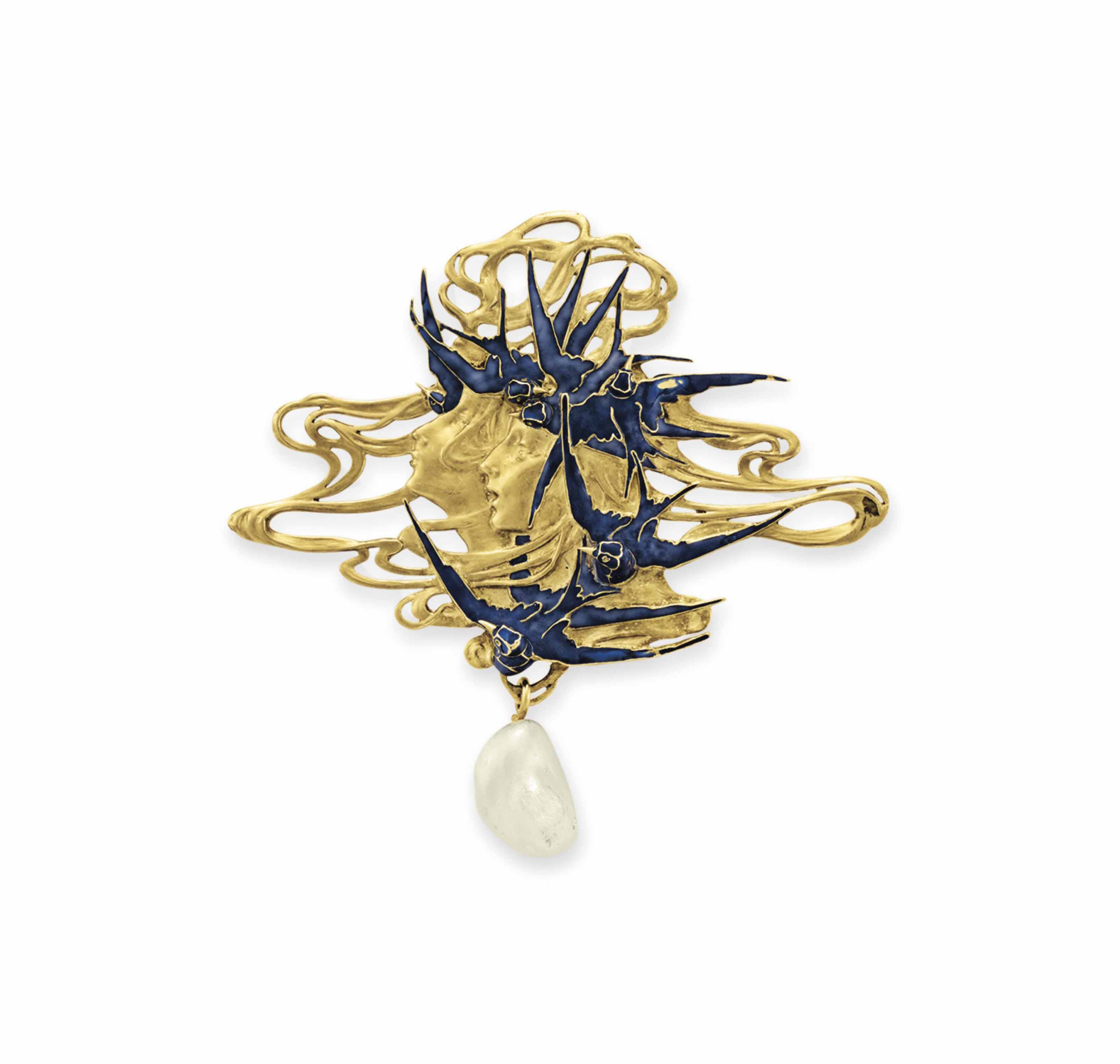 An Art Nouveau Gold Enamel And Pearl Brooch By Rene Lalique