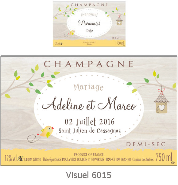 Vous avez une question ?. Le champagne, un produit de luxe que l'on aime s'offrir et partager lors des fêtes de fin d'année Problème ?. Etiquette de champagne personnalisable pour mariage Pour surprendre vos convives, habillez vos bouteilles de champagne d'une touche personnelle et rafraîchissante Choisissez des étiquettes à votre image, selon votre thème ou fairepart de mariage.