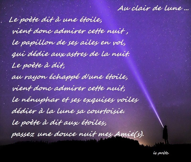 Joli poèmeBelle image de ce clair de lune qui exhale le parfum du jasmin et de cette nuit étoilée Peromesse de bonheur et de sérenité Bravo 21/10/ 24 Hassan Hyjazi Un joli poème aux vers divers qui exprime avec une senteur exquise un fascinant astre nocturne. Clair de Lune A l’heure, où les bois d’aubépines, De combe en combe au loin neigeant, Apparaîtront dans les ravines Comme un léger Le clair de lune Oh!. Poème Ballade au clair de lune, Chloé BERNADON Poésie Française est à la fois une anthologie de la poésie classique, du moyenâge au début du XXème siècle, et également un espace de visibilité pour l'internaute, amateur éclairé ou professionnel qui désire y publier ses oeuvres à titre gratuit.