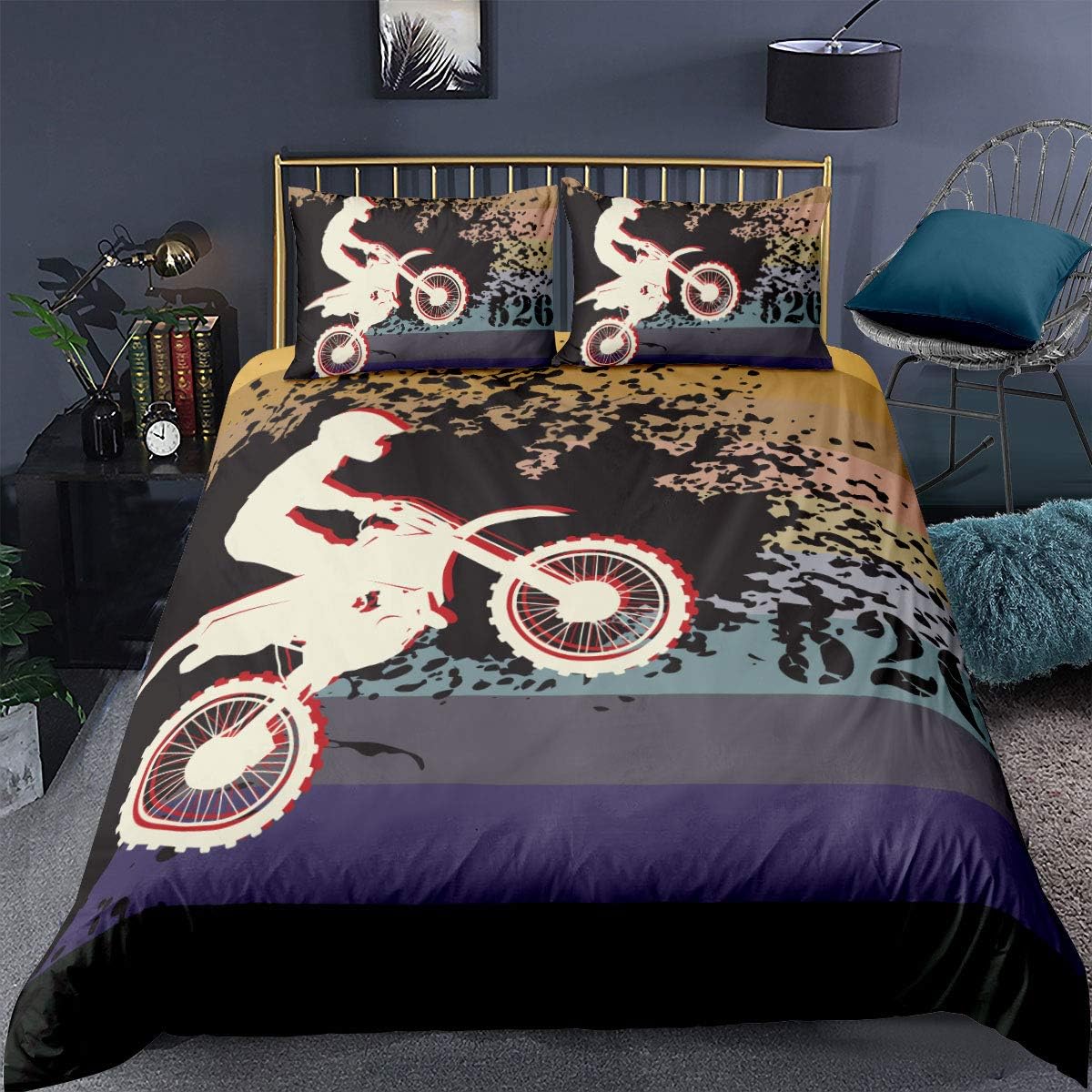 Amazon Com Feelyou Motocross Comforter Cover Sports Rider Championship Abstract Stripe Vintage Style Silhouette Boys Decorative 3 Pieces Bedding Set Queen Size 1 Duvet Cover Set 2 Pillow Shams Zipper Home Kitchen