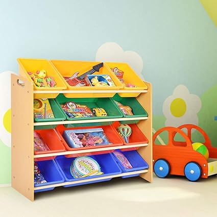 Giow Meuble De Rangement Pour Jouets Avec 12 Bacs Amovibles Colores En Plastique Cadre En Bois Boite De Rangement Pour Jouets D Enfants Pour Chambre A Coucher Amazon Fr Cuisine Maison