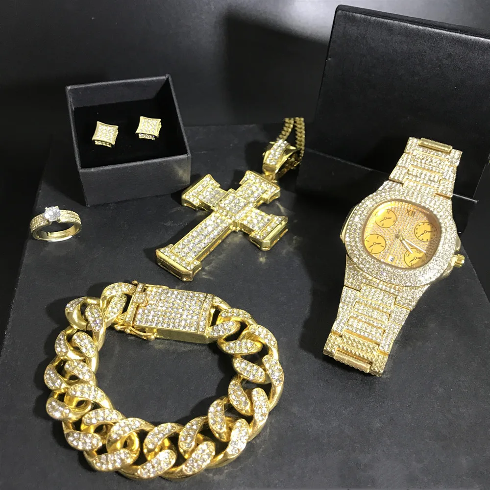 Homme Montre De Luxe En Or Hip Hop Croix Collier Hommes Montre Collier Bracelet Bague Boucles D Oreilles Ensemble Bijoux Jewelry Sets Aliexpress