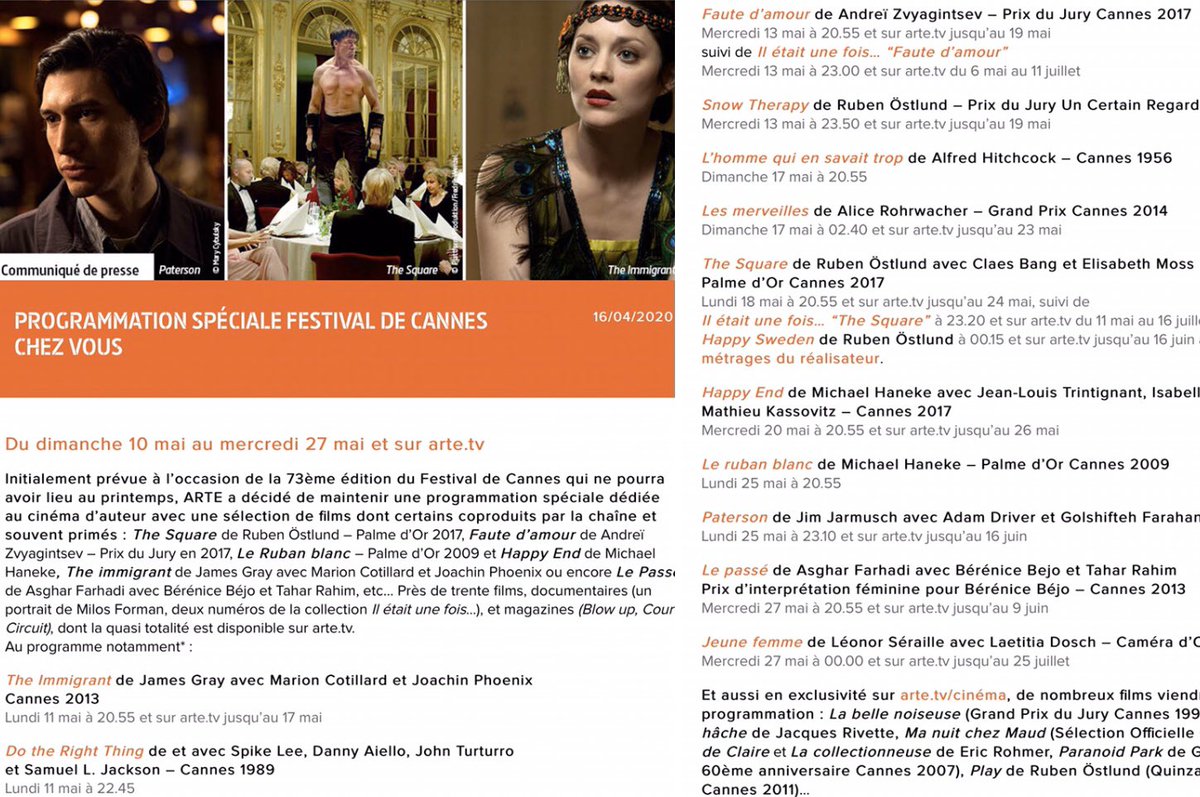 Destination Cine Apparemment Personne N A Averti Arte La Chaine Culturelle Maintient Du 10 Au 27 Mai Sa Programmation Speciale Festival De Cannes Dont Les Dates Initiales Etaient Fixees Du