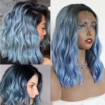 Amazon Com Missyvan Short Blue Hair Bob Wigs Ombre Color Synthetic Lace Front Wigs Wavy Heat Resistant Fiber Natural Hair Line Beauty