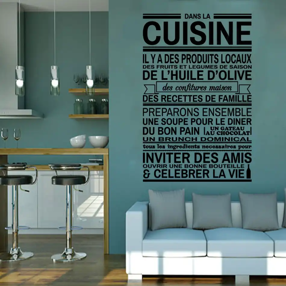 Large choix de stickers muraux pour la décoration de la cuisine Sticker chef, sticker gourmandise, sticker la bonne cuisine de maman, citation cuisine. > Plus d'infos FABRICATION FRANÇAISE RACLETTE OFFERTE à partir de 25€ d’achats PAIEMENT SÉCURISÉ. Quelques mots biens choisis affichés sur vos murs, rien de tel pour donner du caractère à votre domicile Les stickers phrases et citations, ce sont des mots justes, un texte qui touche, qui motive ou qui fait rire, mais toujours avec un sens, et qui ne laissera pas indifférent Vous trouverez des idées de proverbes destinés aux différentes pièces de la maison cuisine, chambre.