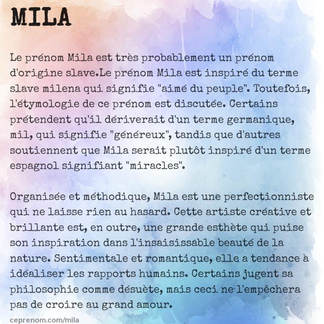 Plus d'informations sur le prénom Mila avec LesPrenomsorg Origine et signification du prénom Mila Popularité du prénom Mila dans 30 pays Découvrez comment s'écrit Mila en japonais ou comment se représente Mila en langue des signes.