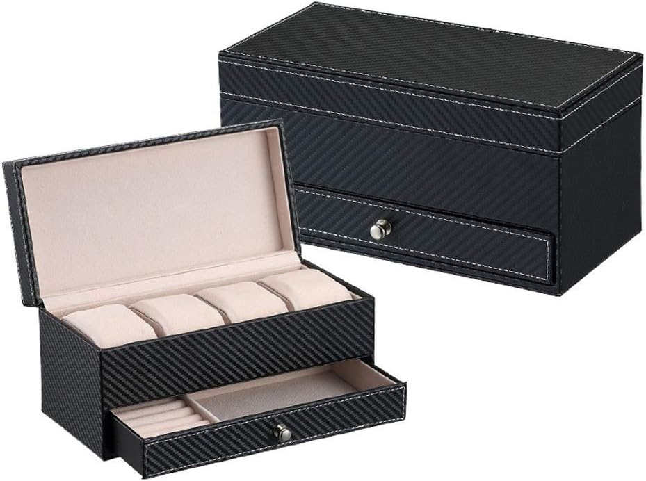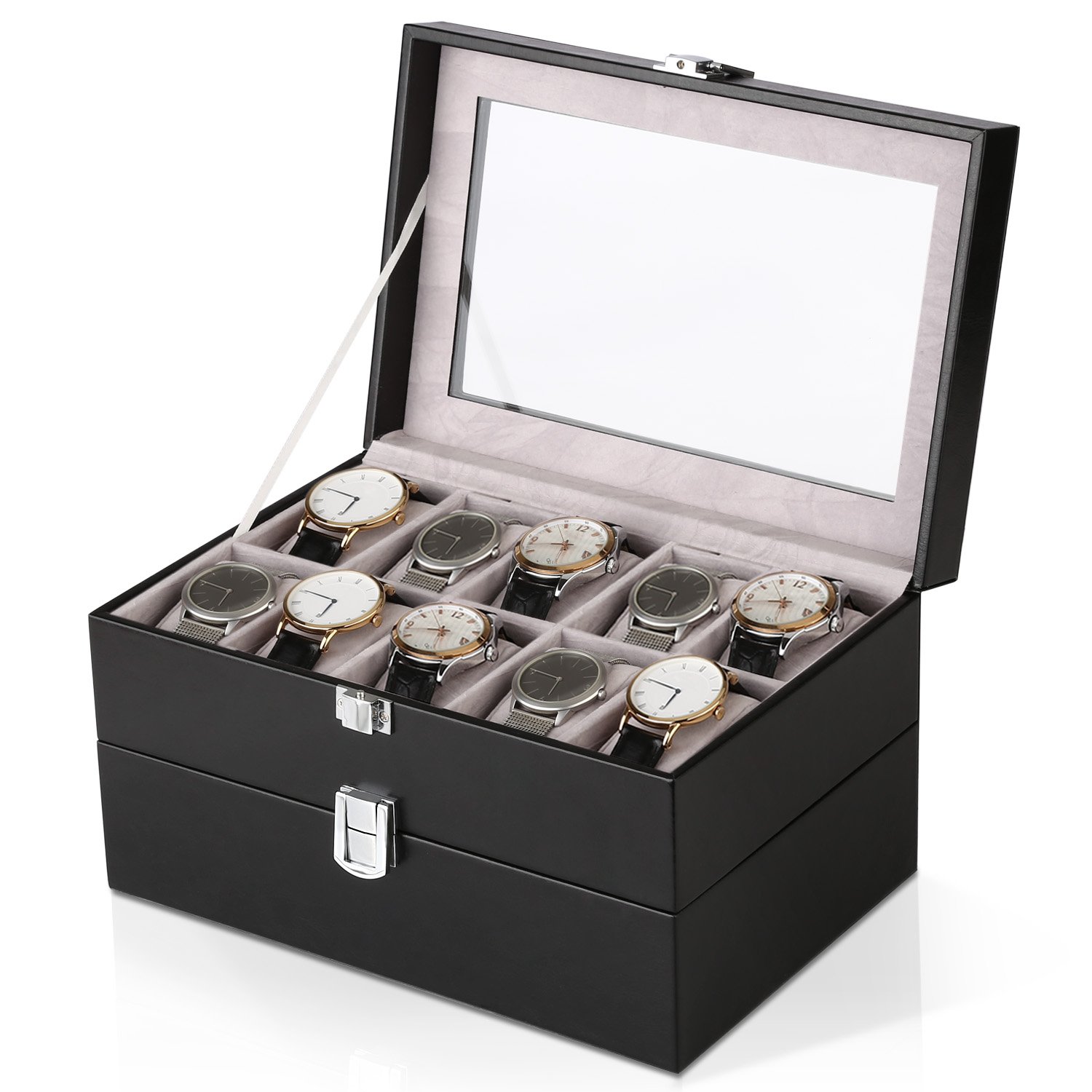 Amzdeal Presentoir De Montre En Cuir Synthetique De Double Couche Boite De Montre Avec Couvercle En Verre Coffret De Bijoux Cadeau Noel Cadeau Pour Homme Noir Amazon Fr Montres