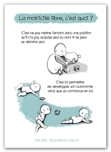 La motricité libre est une méthode d'apprentissage chez l'enfant qui consiste à laisser libre cours à tous les mouvements spontanés sans les lui enseigner Dans le cadre de la motricité libre, l'idée première est de rassurer le nourrisson qui, à partir de 4 mois, pourra s'élancer seul et prendre des initiatives sur ses mouvements. La motricité libre s’exerce toujours en présence de l’adulte, qui porte une observation attentive et sécurisante Commenter les actions de l’enfant, l’observer vivre des expériences positives pour pouvoir le gratifier, ce qui renforcera son estime, font partie intégrante du rôle de l’assistant maternel. Pour aller plus loin Si vous souhaiter mettre en place la motricité dans son paroxysme le plus total, vous devez bannir un nombre de matériel de puériculture impressionnant Du transat en passant par le trotteur ou le porteur Et c’est sans oublier les lits à même le sol que l’on voit partout.