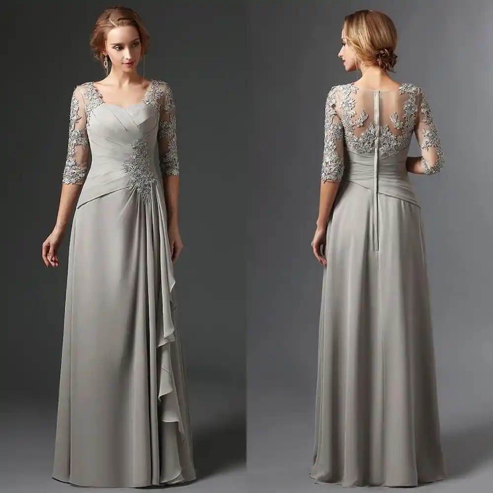 Argent Nouvelle Mere De La Mariee Robes A Ligne 3 4 Manches En Mousseline De Soie Dentelle Grande Taille Longue Elegante Marie Mere Robes De Mariage Aliexpress