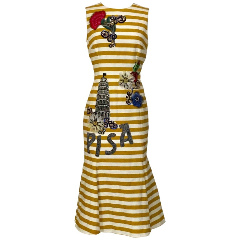 New Dolce And Gabbana Yellow And White Striped Tower Of Pisa Flared Midi Dress For Sale At 1stdibs