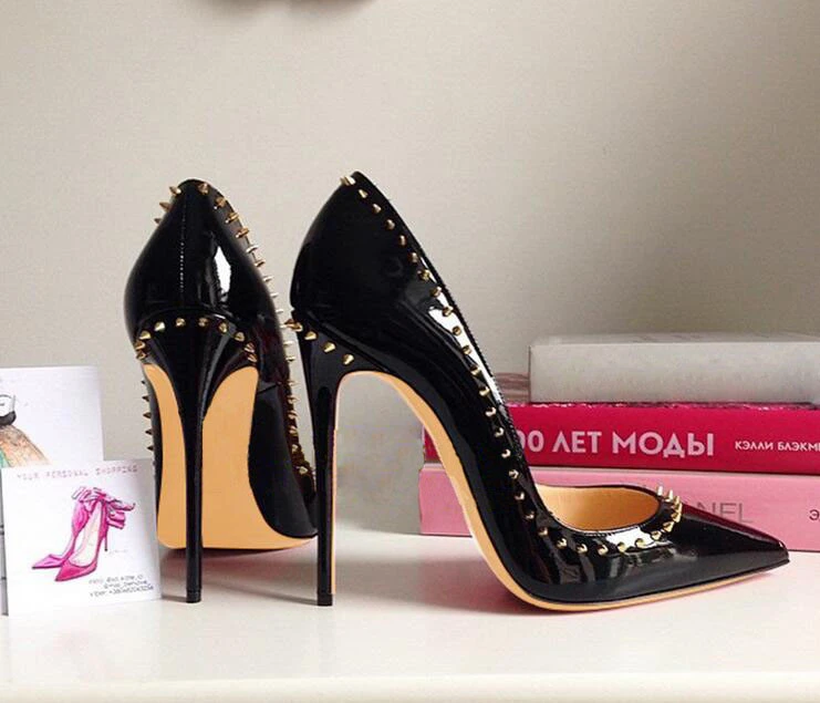 Yue Jabon Chaussures Italiennes A Bout Pointu Chaussures Sexy A Talons Hauts Pour Femmes Escarpins A Rivets Noirs Avec Pointes En Cuir Verni Aliexpress