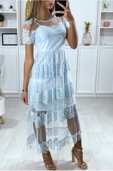 Long Blue Dress In Veil Lined With Lace