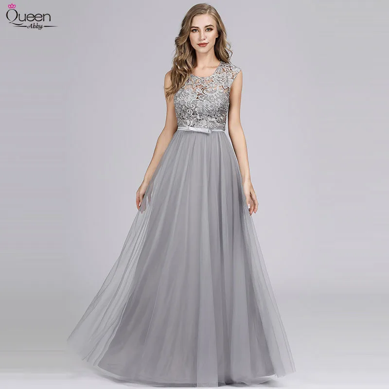Robe De Demoiselle D Honneur En Dentelle Longue Grise Pour Soiree De Mariage Robe De Demoiselle D Honneur Formelle Elegante Coupe Nœud Coupe A Line Col Rond Aliexpress