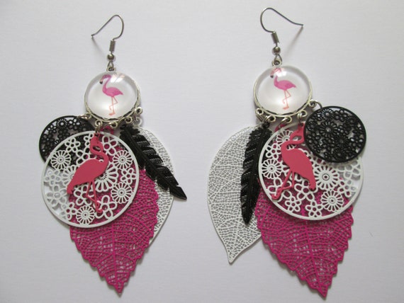 Boucles D Oreilles Cabochon Et Estampes Modele Flamant Etsy