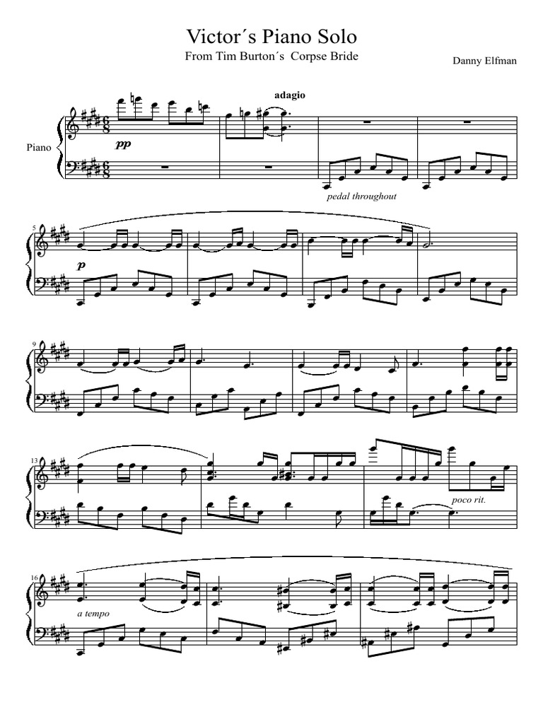 Victor's Piano Solo is a fun piano piece of medium difficulty to play It comes from a quirky gem of an animated film, The Corpse Bride, which is also a musical This can also be played as a duet!. Corpse Bride piano duet (solo) File Size 32 kb File Type pdf Download File Corpse Bride tears to shed File Size 1280 kb File Type pdf Download File Corpse Bride remains of the day File Size 2966 kb File Type pdf Download File Corpse Bride moon dance File Size 730 kb File Type pdf Download File Corpse Bride. Victor's Piano Solo from Tim Burton's Corpse Bride Written by DANNY ELFMAN by DUNCAN BOHANNON POCO.