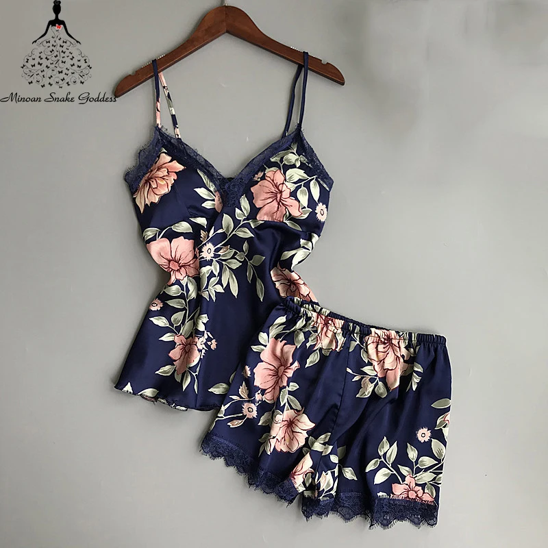 Pyjama Femme Ensemble De Shorts Bowknot De Pyjamas De Vetements De Nuit En Satin Imprime Dentelle Pour Femmes Bleu Achat Vente Pyjama Cdiscount