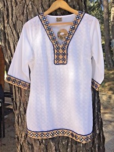 Joli Tunique Haut Coton 100 Decollete Avec Strass Indou Femme Ete Blanc Bleu Ebay