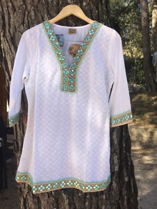Joli Tunique Haut Decollete Coton 100 Indou Femme Ete Blanc Vert D Eau Ebay