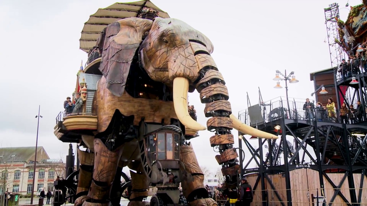 L'ÉLÉPHANT Le Grand Éléphant des Machines de l’île mis en scène dans cet opus réalisé par Gaëtan Chataigner pour le Voyage à Nantes 16 !. Nantes est une jolie ville Depuis maintenant plusieurs années, elle abrite, les célèbres Machines de l’Ile, situées en bord de Loire sur l’Ile de Nantes. L’Éléphant, Nantes’ Giant Mechanical Elephant Nantes’ giant mechanical elephant was the first big project born in the Galerie des Machines Le Grand Éléphant is a huge living machine made of steel and wood who likes to wander around the Ile de Nantes The elephant can carry up to 50 passengers on his back on a funny, original 30.