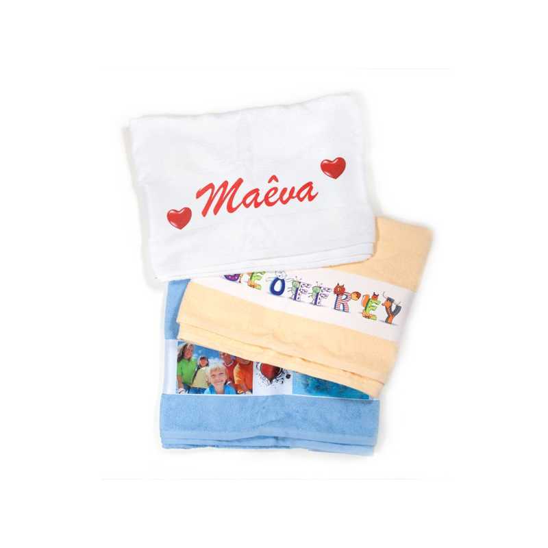 Serviette de bain personnalisée en coton est une belle idée cadeau pour la famille et les amis Le serviette personalisée en coton est un support idéal pour réaliser un photomontage et afficher vos plus belles photos de façon originale. Un cadeau unique La serviette de toilette personnalisée 50X100 cm – Belle qualité de serviette Serviette de bain en éponge 100% coton à personnaliser avec le prénom ou le texte de votre choix Emballage cadeau compris. Les serviettes et draps de bain personnalisés font des superbes cadeaux pour tant d'occasions Un cadeau de naissance, de crémaillère ou pourquoi pas de mariage, pour toute ces occasions une serviette personnalisée est ce cadeau personnel qui fait toute la différence !.