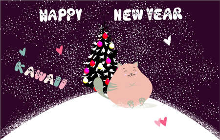Happy New Year Banner In Kawaii Style With Cute Funny Cat Text Christmas Tree Snow Hearts On A Dark Background Royalty Free Vector Graphics