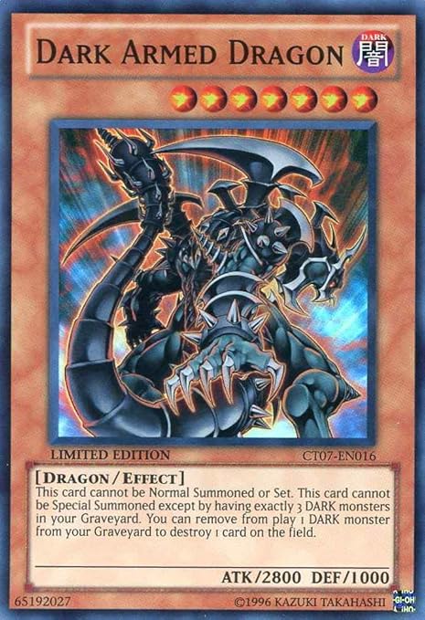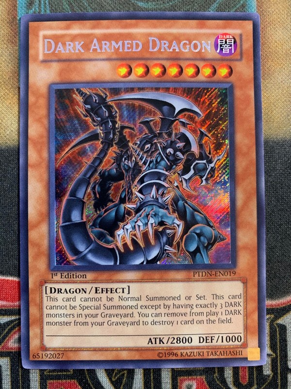 Dark Armed Dragon PTDNEN019 Secret Rare Unlimited Edition Yugioh LP $ Free shipping YuGiOh Dark Armed Dragon Ptdn English Version 1st Secret Rare Yugioh Psa7 Used $ Free shipping YuGiOh Secret Rare Asian Edition Armed Dragon Lv10 White Three $ shipping $00 shipping. $ 100 Usado Dark Armed Dragon Ct07 Haru Card Shop!. Dark armed dragon has a very useful effect it can only be special summoned while you have exactly 3 dark monsters in your graveyard getting 3 dark monsters there isn't hard and there's too much, cards that will remove them are in the deck (strike ninja, prometheus, etc) and with dark armed dragon's remove a dark monster from play effect, the deck would have cards like dimension fusion.