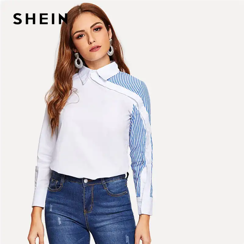 Shein Blanc Raye Bouton Decoration Chemise Chemisier Chic Femmes Ete Automne Asymetrique Placket Col Rabattu Blouses De Bureau Aliexpress