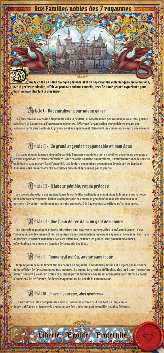 Game of Thrones (TV) () A Song of Ice and Fire George R R Martin () A Song of Ice and Fire & Related Fandoms (111) Harry Potter J K Rowling (496) Game of Thrones RPF (226) Marvel Cinematic Universe (186) Supernatural (131) The Avengers (Marvel Movies) (123) Star Wars All Media Types (111) Teen Wolf (TV) (85). Poster Game Of Thrones les 7 Royaumes Carte de Westeros 61 cm x 91,5 cm Avis clients Poster Game Of Thrones les 7 Royaumes 61 cm x 91,5 cm Soyez le premier à partager votre avis sur ce produit Donner votre avis Votre avis a été enregistr é À ne pas rater VOIR AUSSI. En 16, Tim Phillips et Rebecca Clare ont publié Game of Thrones – Les stratégies des 7 royaumes appliquées à la vie professionnelle En politique, le président américain Donald Trump a récemment voulu profiter de la popularité de la série dans ses tweets en reprenant ses codes graphiques et en détournant la devise " Winter is.